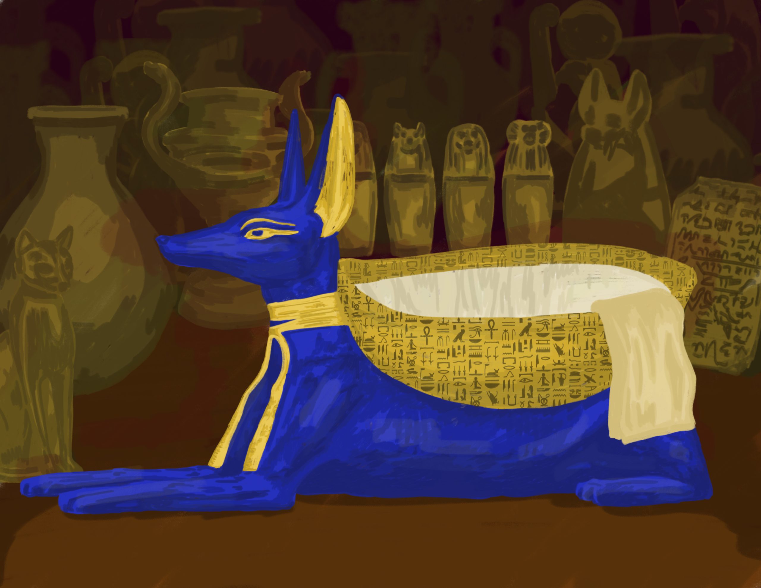 King Tut’s heart is missing because his embalmers—those expert priests with their canopic jars and natron mounds—were startled by the too-close laughter of a child and turned their backs, just for a moment. Any dog owner knows what could happen. The cats were sacred, but the dogs were everywhere.